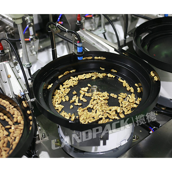 該臺(tái)每日堅(jiān)果包裝機(jī)是由水平給袋式包裝機(jī)主機(jī)、Z型自動(dòng)上料機(jī)、震動(dòng)盤三大件組成的,該機(jī)的工作流程是:操作人員把物料倒入震動(dòng)盤當(dāng)中,一袋包裝多少種物料,就配置多少個(gè)震動(dòng)盤,震動(dòng)盤把物料輸送到傳送帶當(dāng)中,在通過Z型上料機(jī)把物料輸送到袋子當(dāng)中,然后進(jìn)行下料,充填、打碼、封口等一系環(huán)節(jié)完成包裝過程。